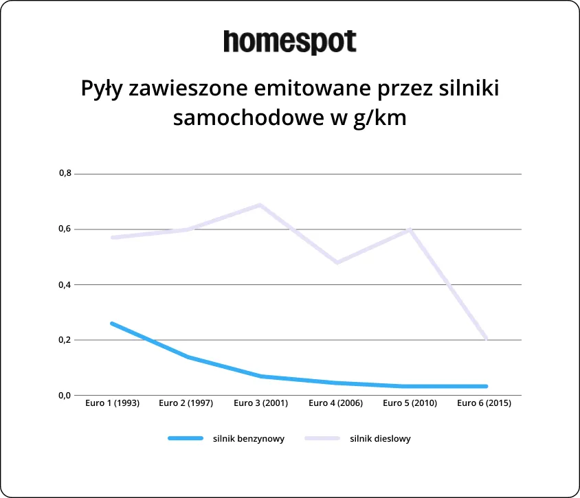 Wprawdzie pod względem emisji tlenków azotu najnowsze diesle prezentują się już podobnie do silników benzynowych, ale ilość pyłów zawieszonych emitowanych przez pojazdy spełniające najnowszą normę Euro 6 ciągle jest wyższa od ilości pyłów wytwarzanych przez auta z silnikiem benzynowym, zgodne ze starszą o 19 lat normą Euro 2.