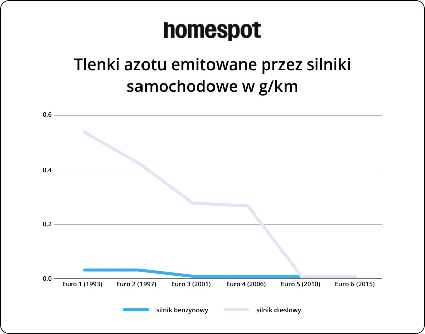 Nowsze samochody spełniają bardziej rygorystyczne normy europejskiego standardu emisji spalin. Zależność pomiędzy rocznikiem auta i typem posiadanego silnika a ilością wytwarzanych zanieczyszczeń prezentują poniższe wykresy: