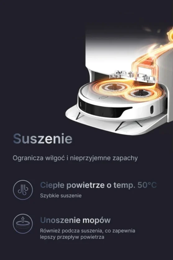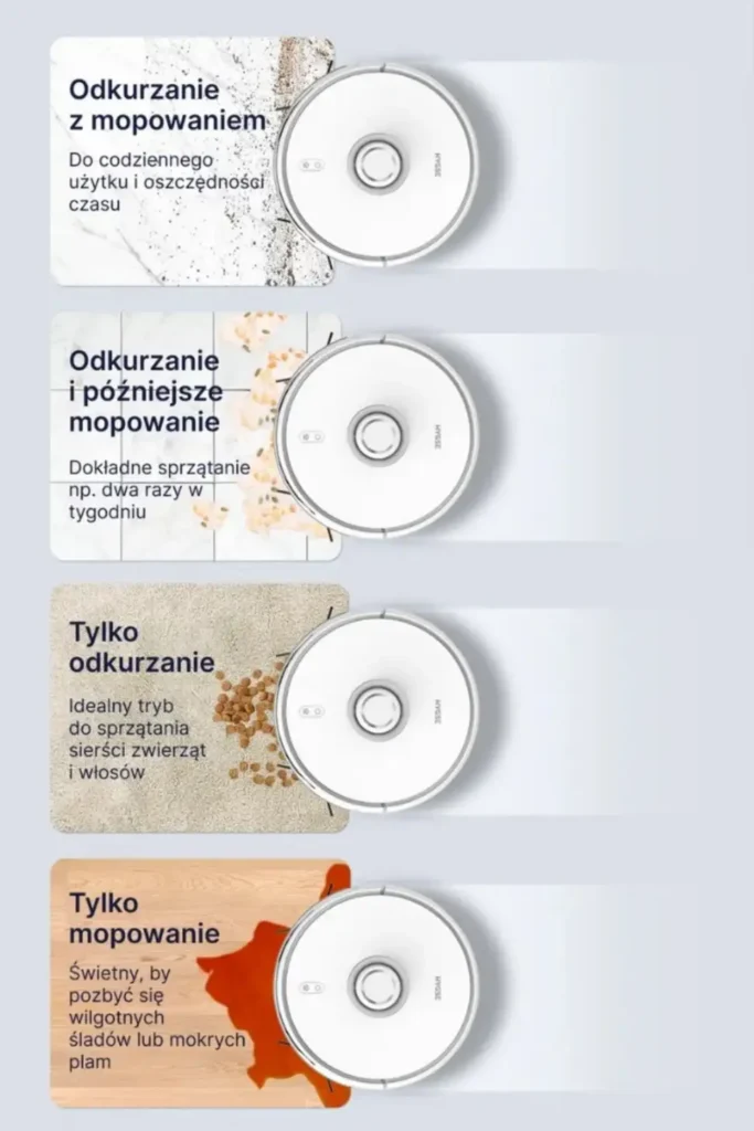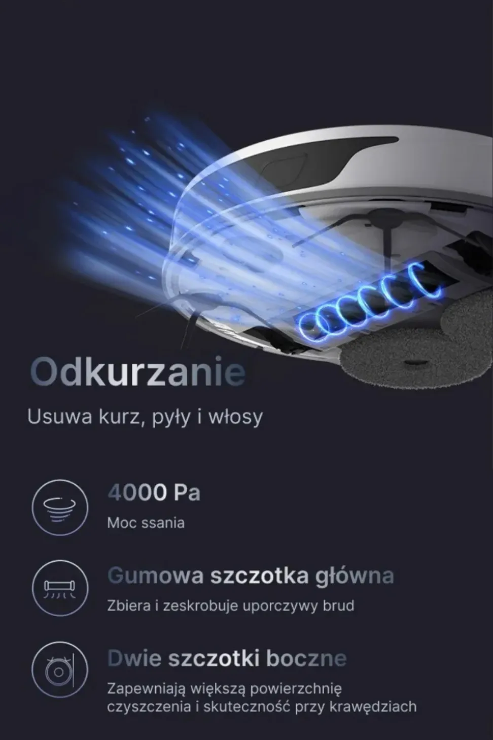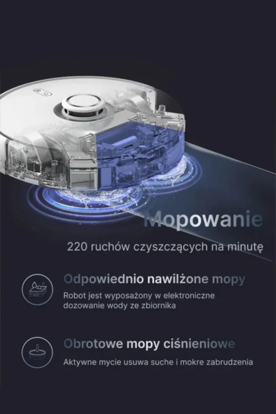 Obrotowe mopy zapewniają dokładne usuwanie nawet trudniej zmywalnych zabrudzeń, natomiast funkcja wykrywania dywanów zapobiega ich moczeniu.