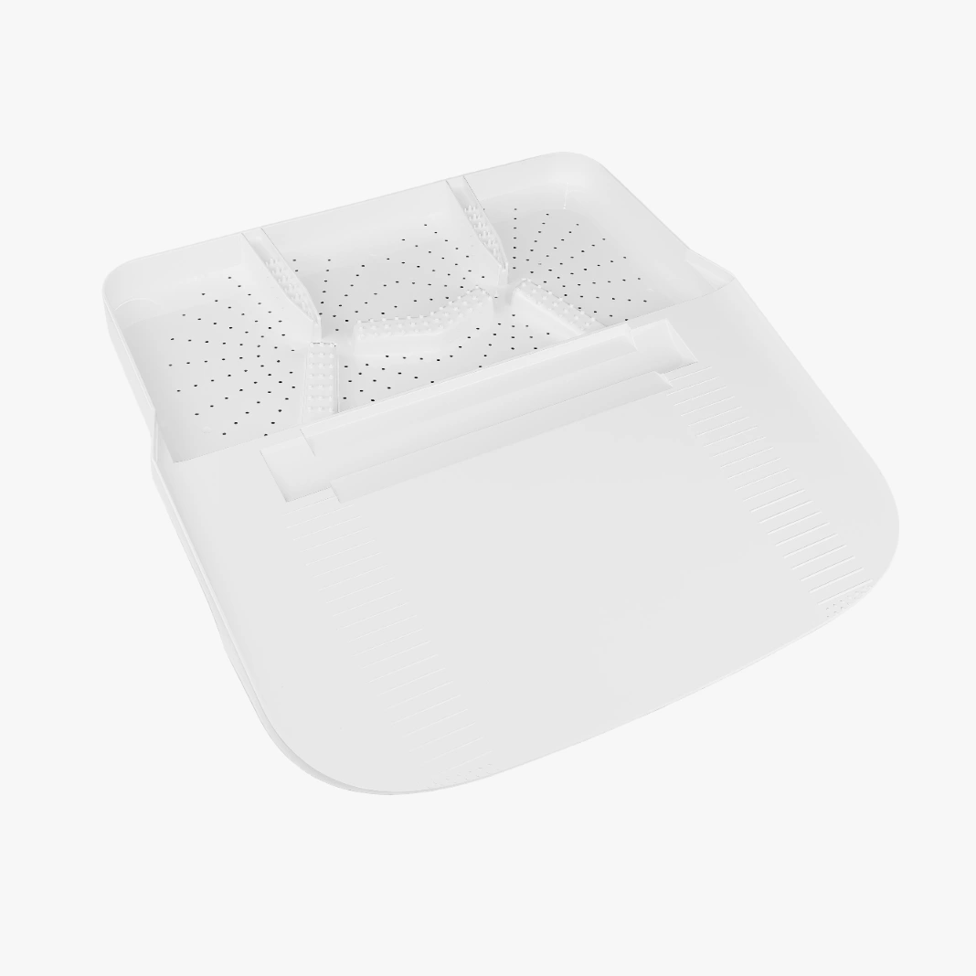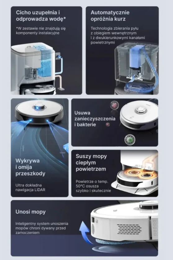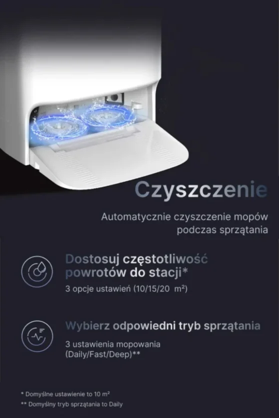 Dla zapewnienia użytkownikowi jeszcze większego komfortu sprzęt został wyposażony w funkcje automatycznej wymiany wody i czyszczenia mopów.